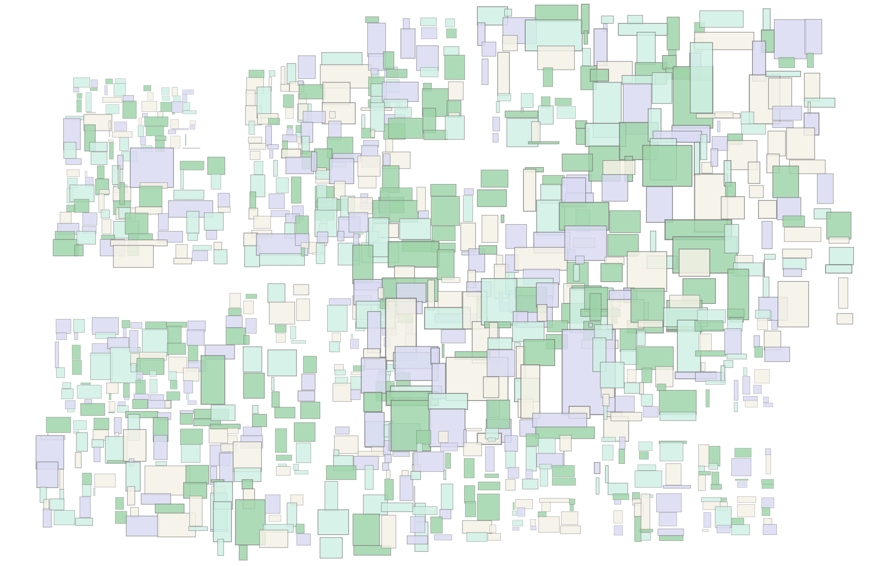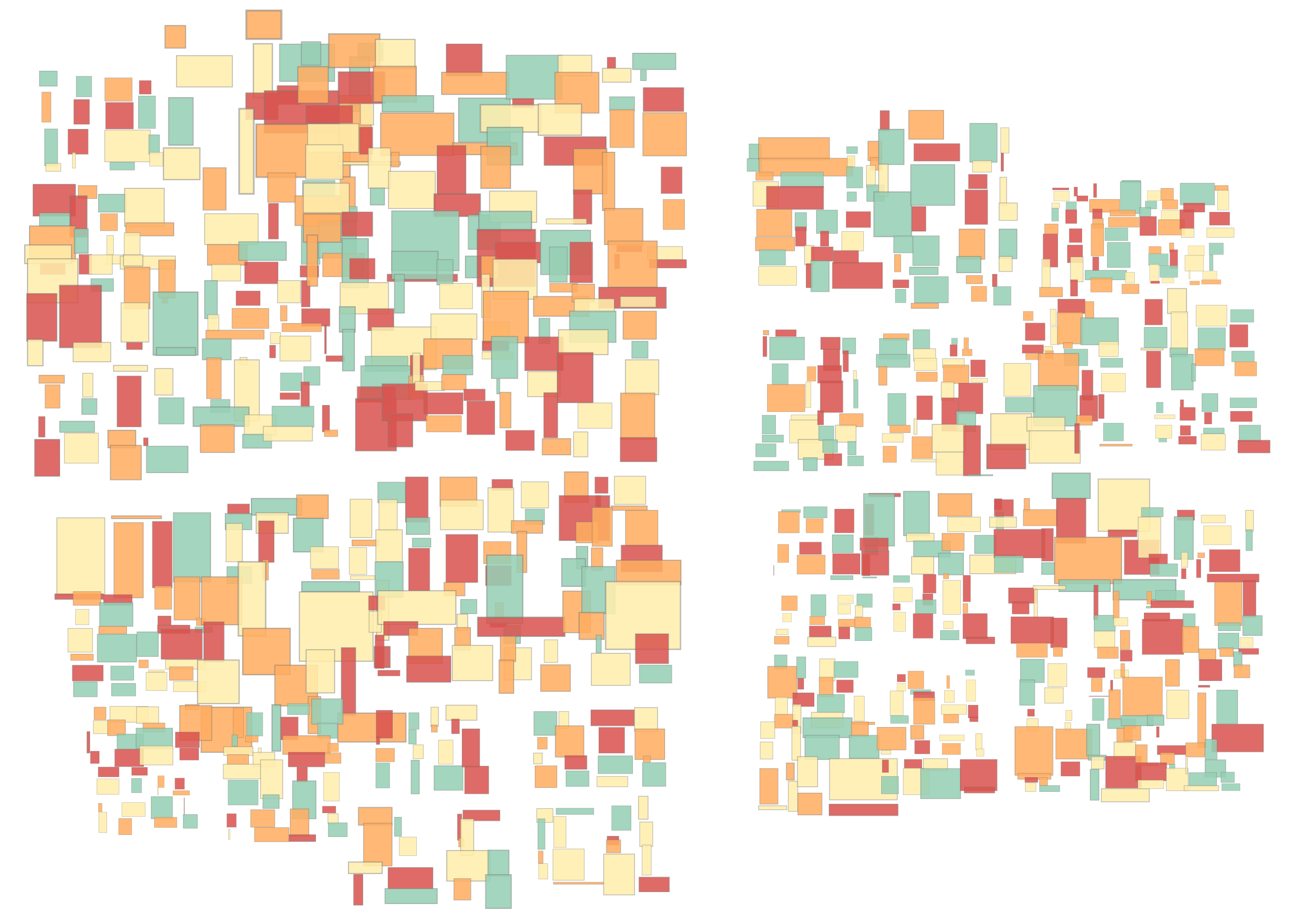 KDTree本身就呈现出很有意思的秩序感,我可以再加些颜色和缩放看看,假设想要针对每一层包围矩形实施中心缩放操作,并使其内部子包围矩形也会被相应缩放,貌似比较麻烦,但因为上面在生成KDTree数据的时候已经将每一层划分的包围矩形映射到子坐标系了,所以只需要针对每一层子坐标系做中心缩放即可。其次,要填充包围矩形很简单,直接挑选喜欢的颜色调用Fill接口就可以绘制填充色了, 这里我们只填充叶子节点的包围矩形,这两部操作的实现只需要将上面的draw-kdtree拓展为: